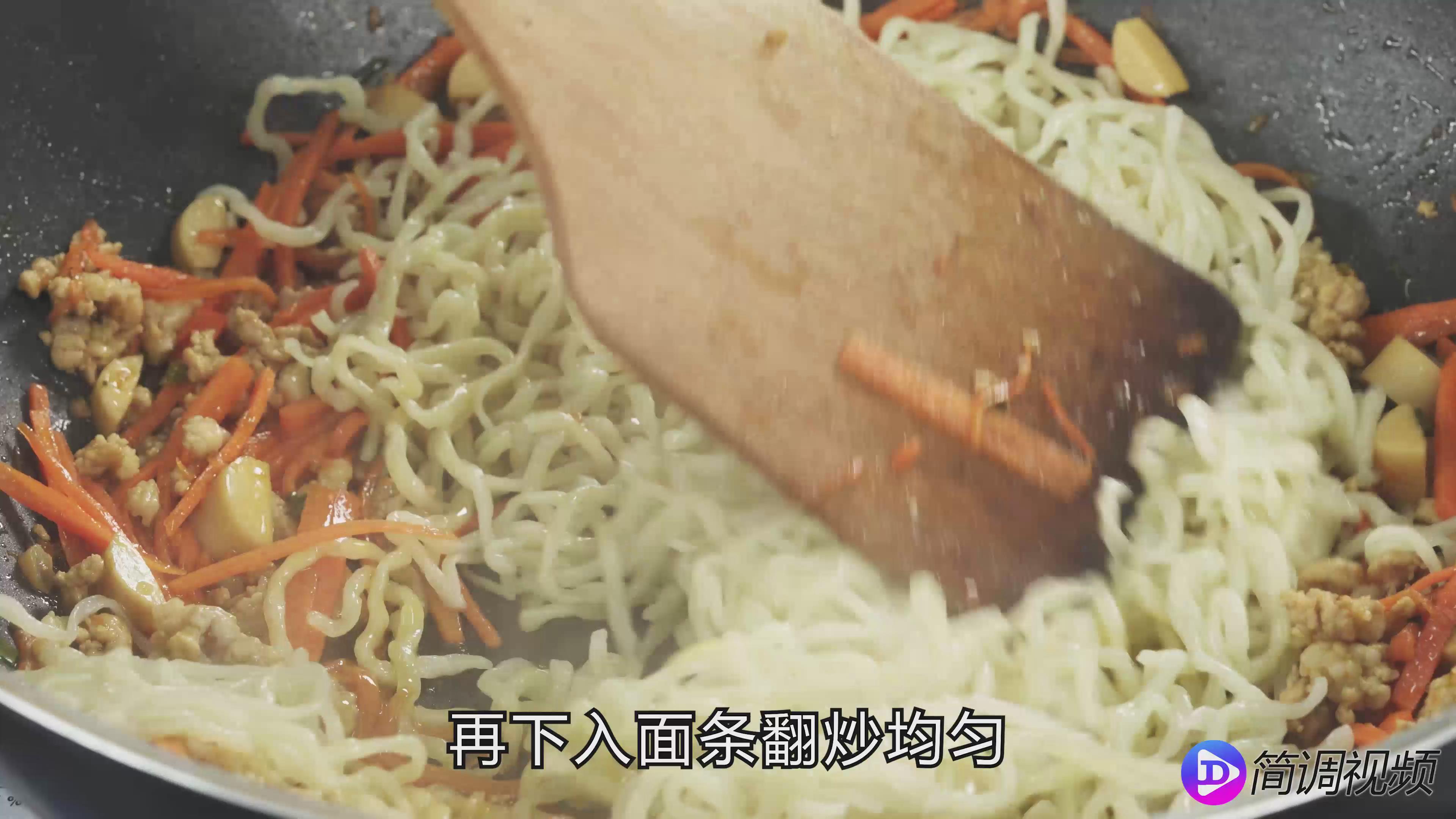 第四步:加入胡萝卜和火腿丁,炒匀,放入面条,炒匀,装盘,撒上葱花。