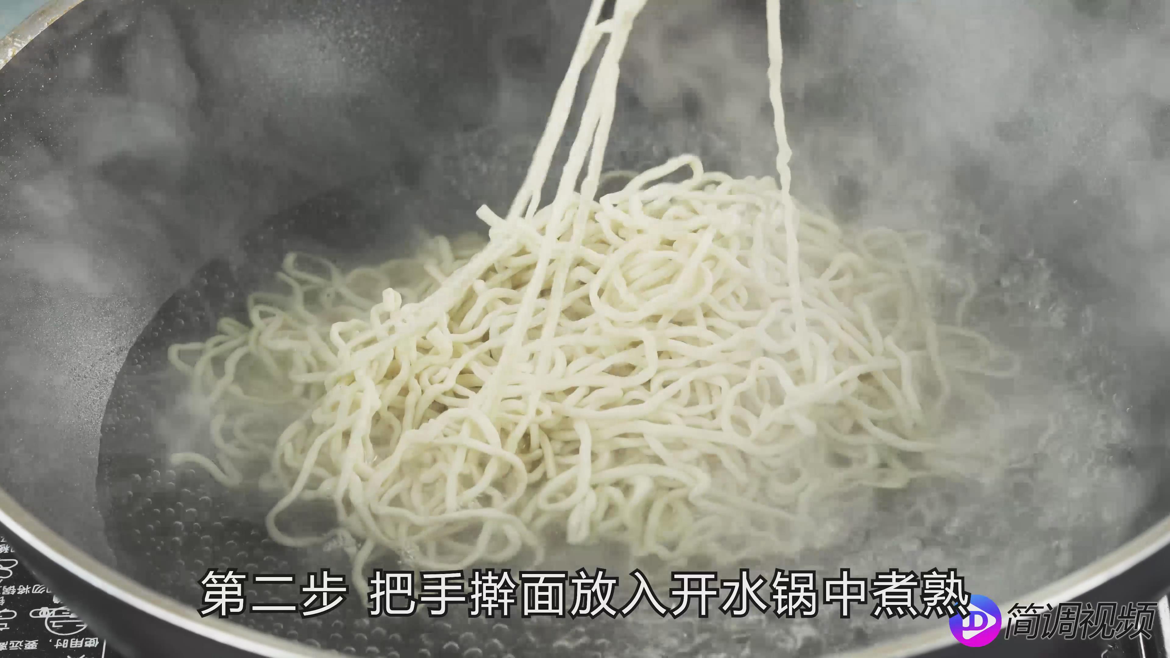 第二步:将手擀面放入沸水锅中煮,然后取出,立即放凉。晾干后,加入少许植物油,防止面条粘连。