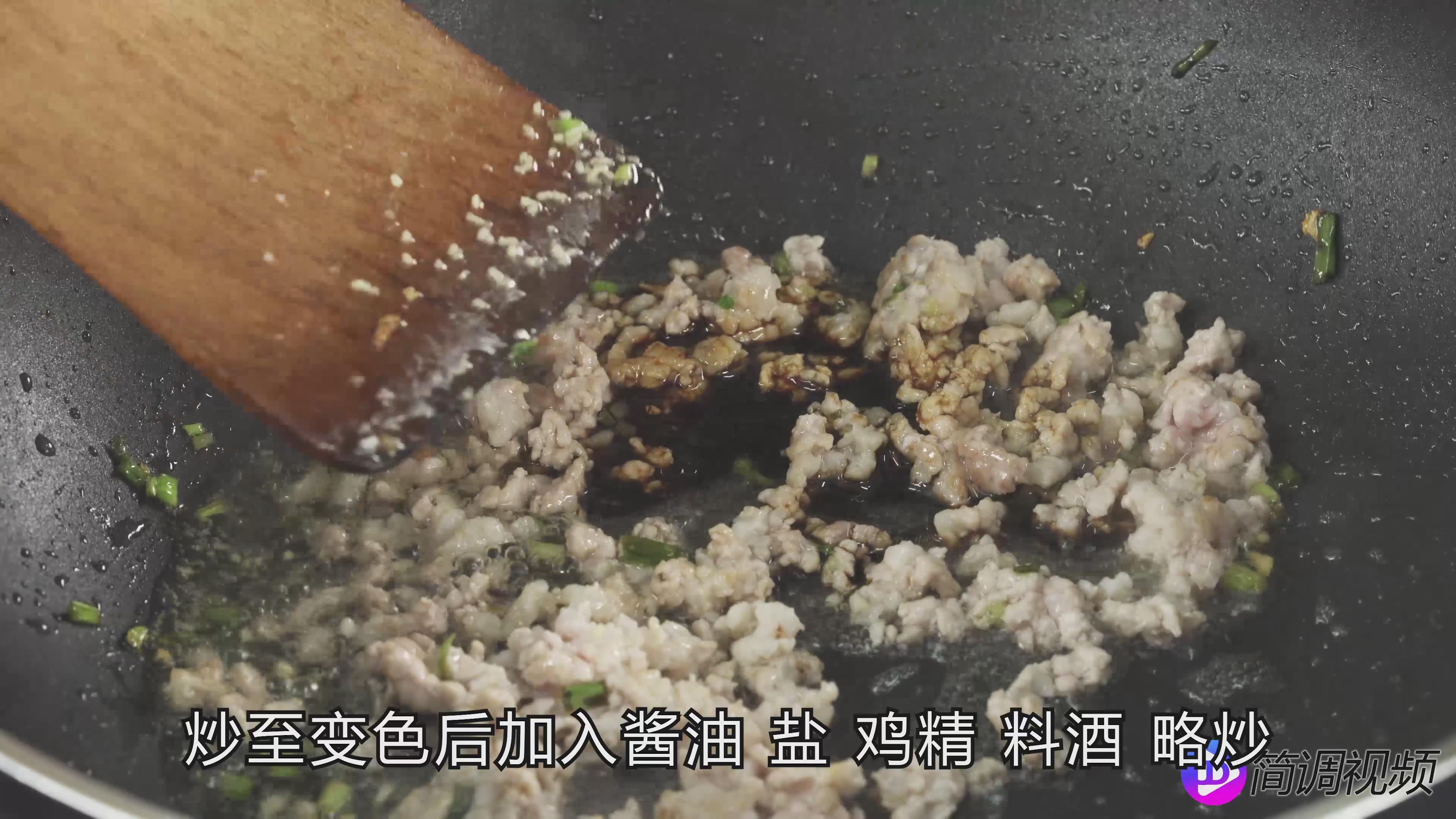 第三步:炒锅倒入适量油,烧热,放入葱花炒香,然后放入肉末,翻炒至变色,再放入酱油、盐、鸡精、料酒略炒。