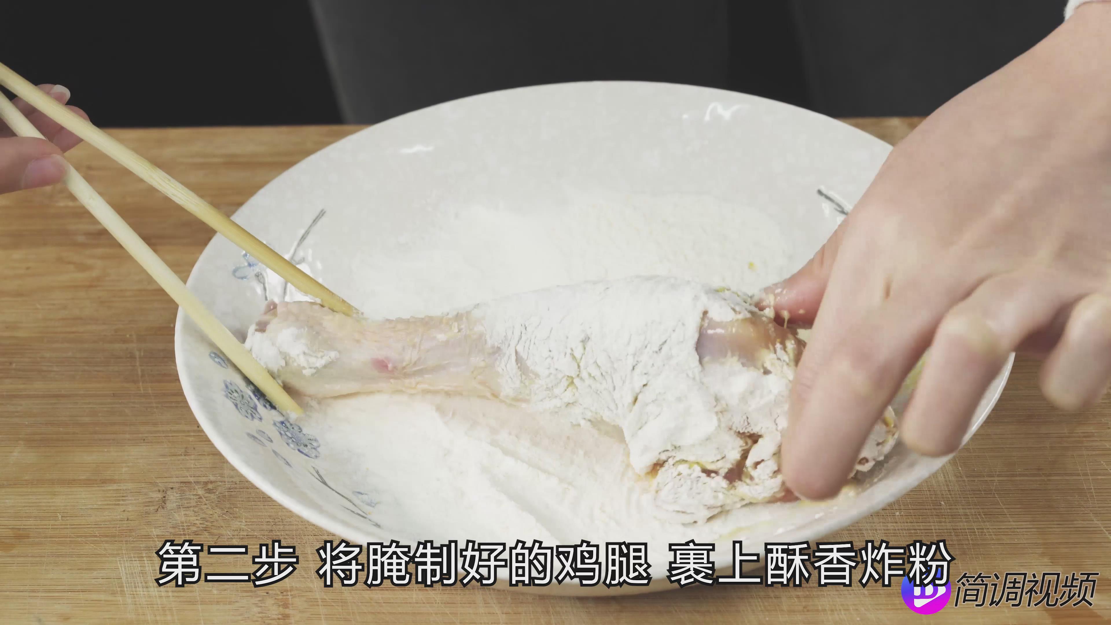 第二步:将腌制好的鸡腿裹上香酥炸粉。