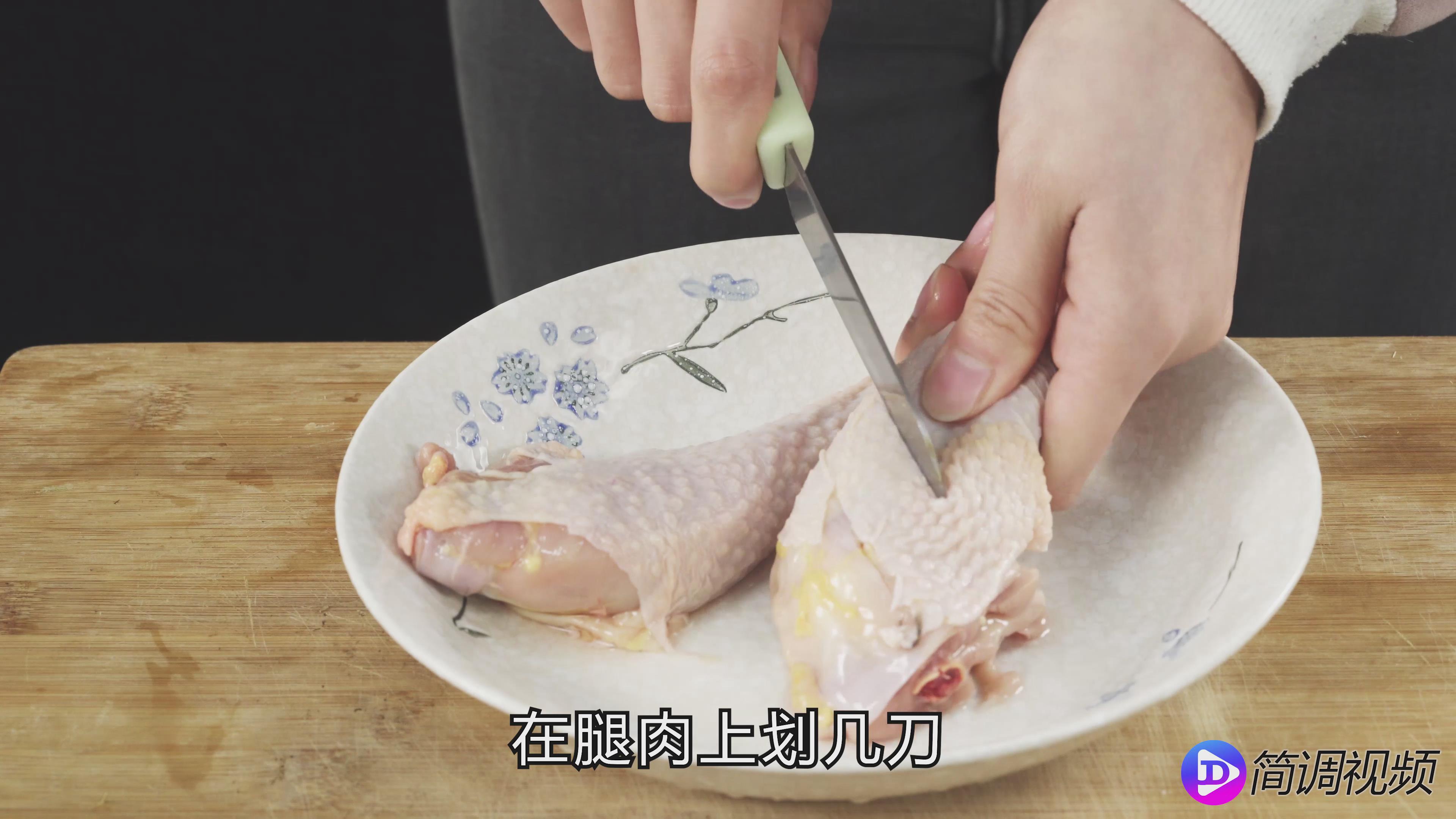 第一步:将鸡腿洗净放在盘子里,在腿肉上切几刀,然后加入料酒和盐,搅拌均匀,腌制半小时。