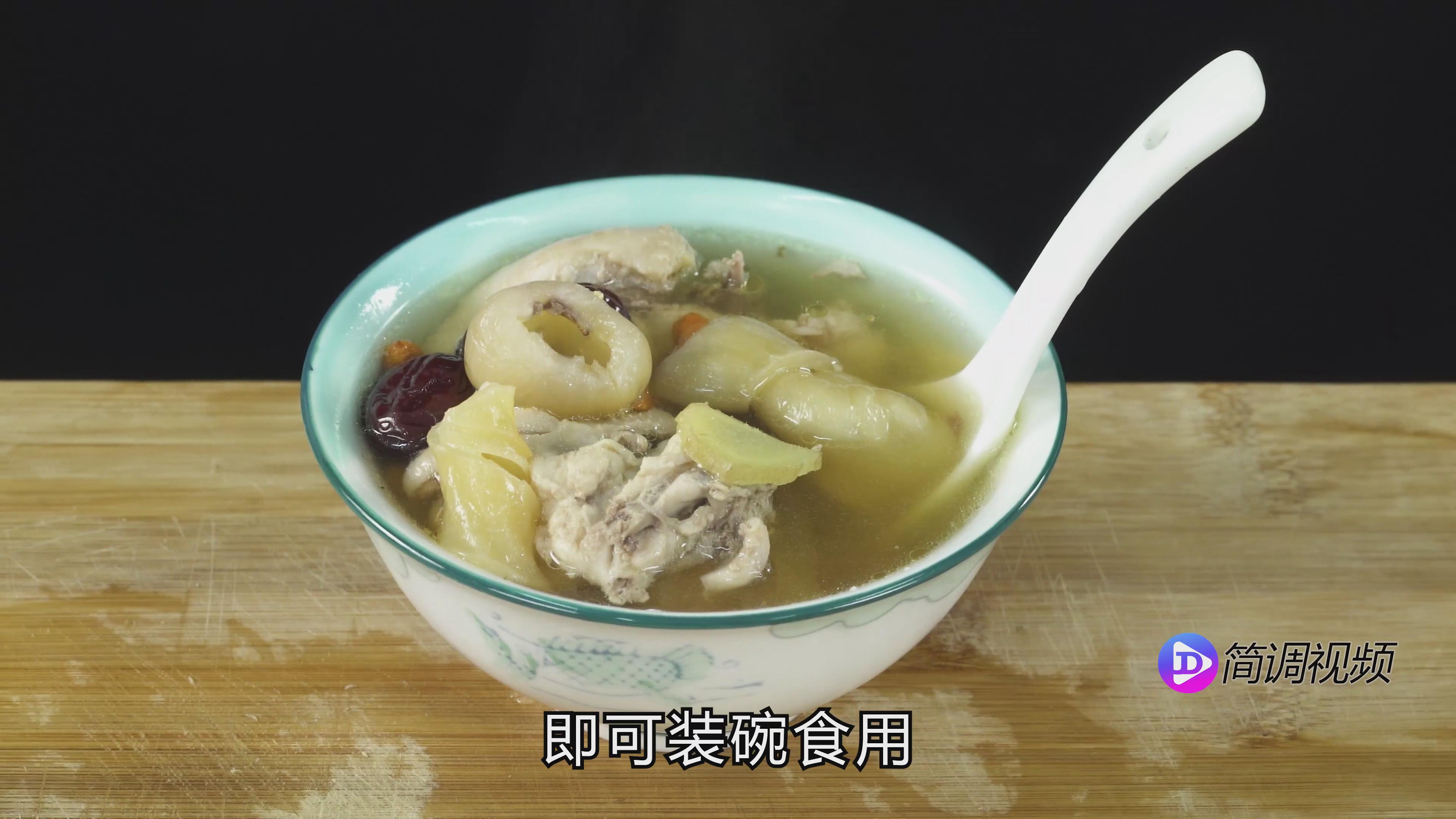 第三步:鸡肉去腥后,夹出鸡肉放入锅中,然后放入红枣、桂圆、姜片,将泡好的花胶放入锅中,然后倒入清水,直到食材都没有了。
