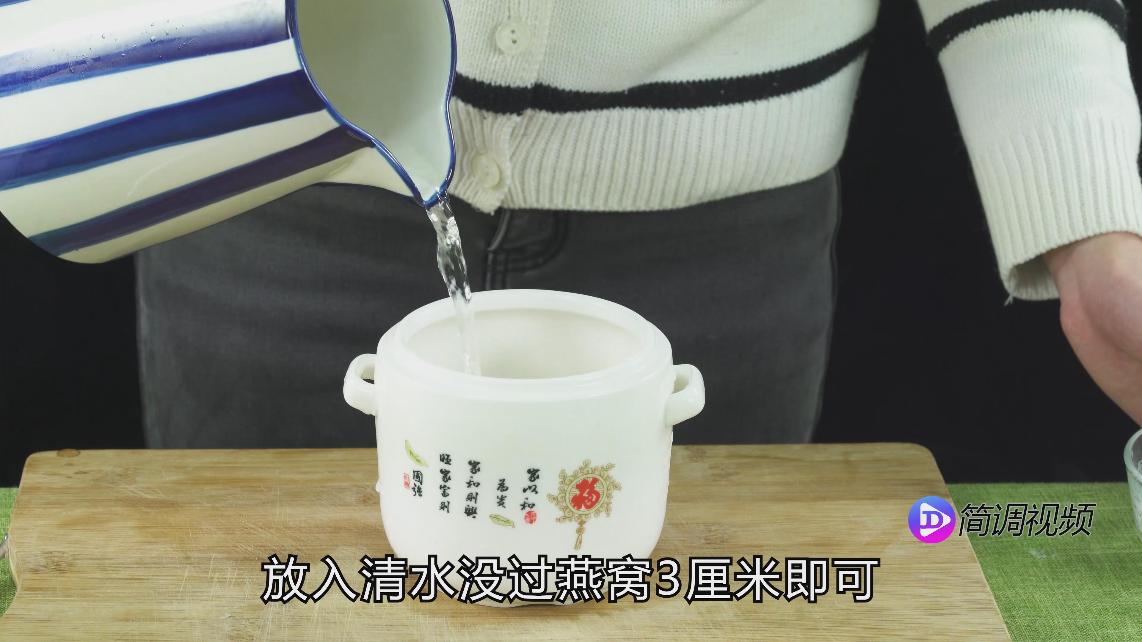 第二步:将燕窝放入锅中,加入清水至燕窝达到3cm,然后将锅放入锅中炖20分钟。