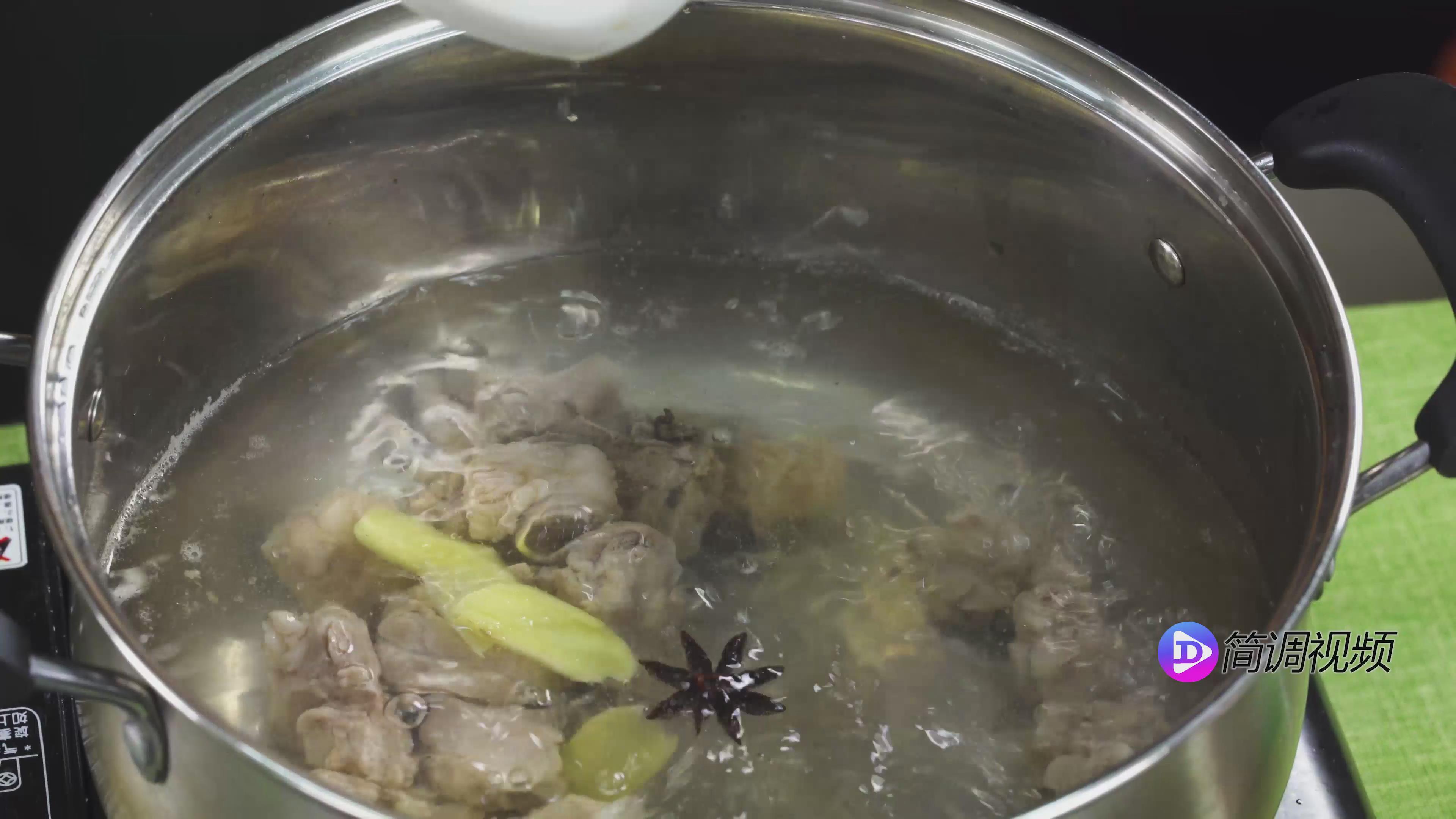 第三步:锅中放入适量的水烧开,加入姜片、料酒、八角放入排骨,大火烧开后转小火。