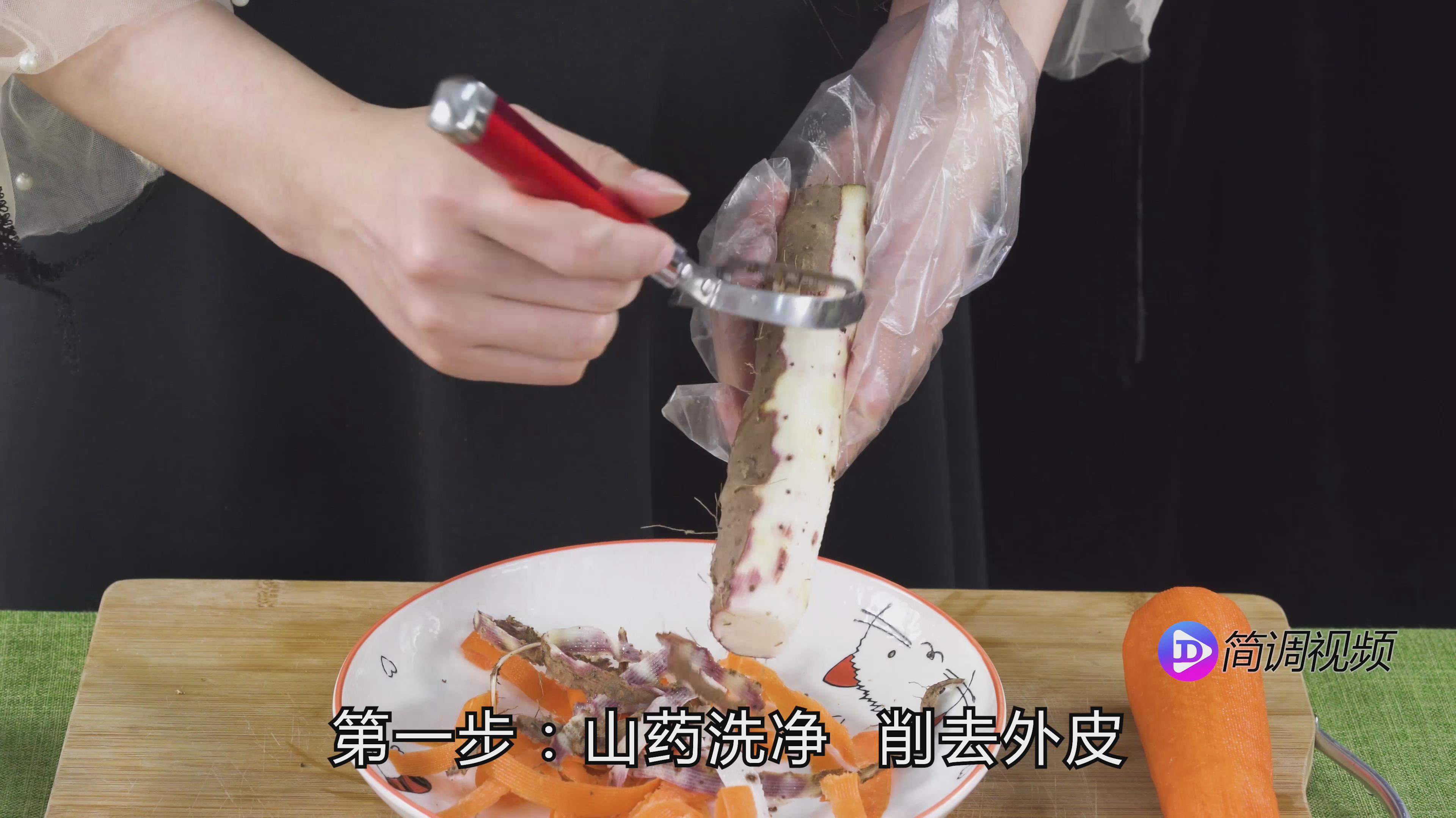 第一步:山药洗净,去皮,切成滚刀块备用;将胡萝卜也切成滚刀块。