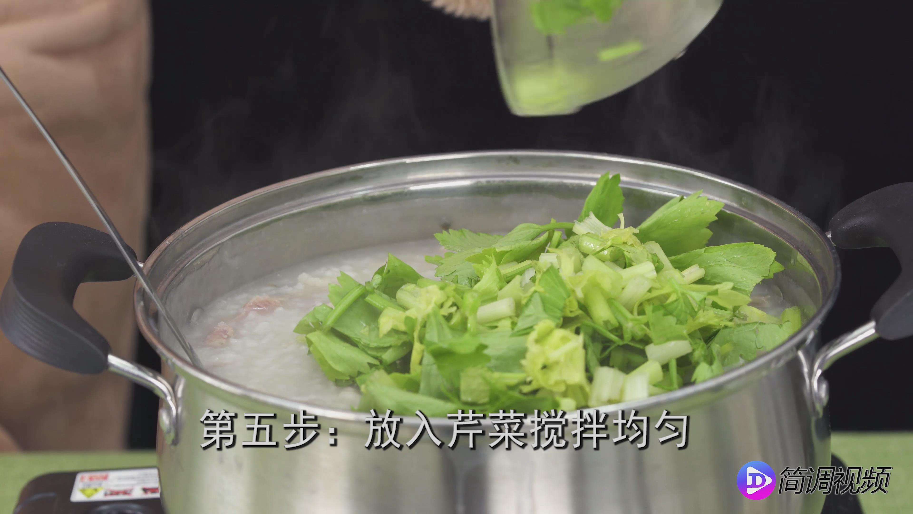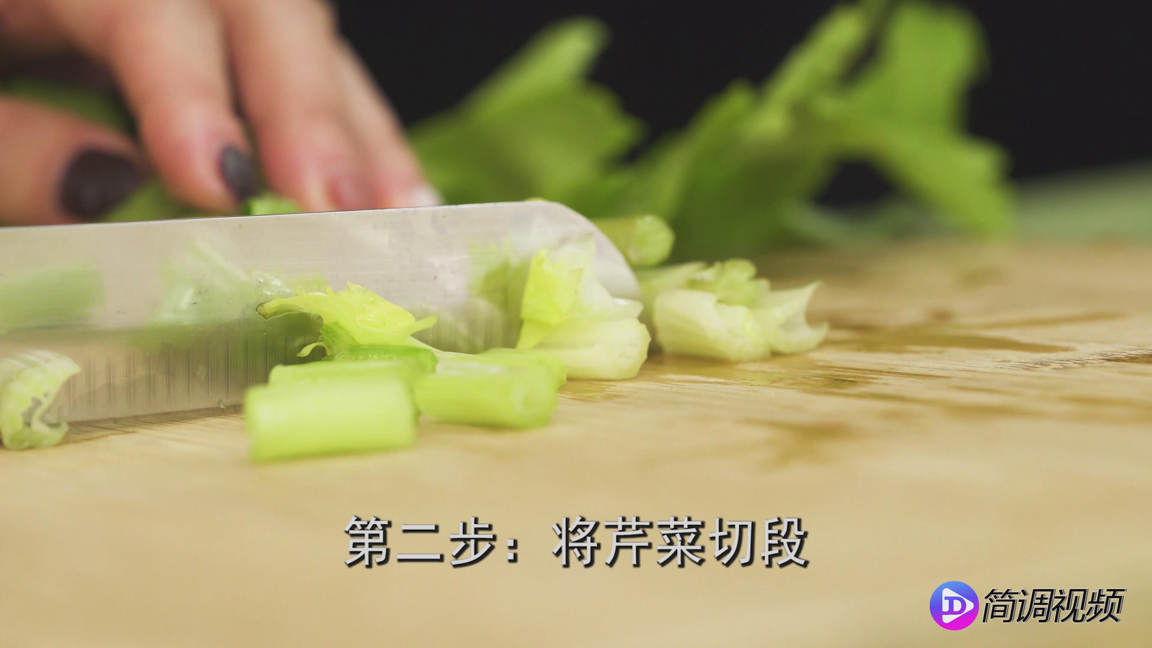 第五步:加入芹菜,搅拌均匀,加入适量的盐,即可食用。