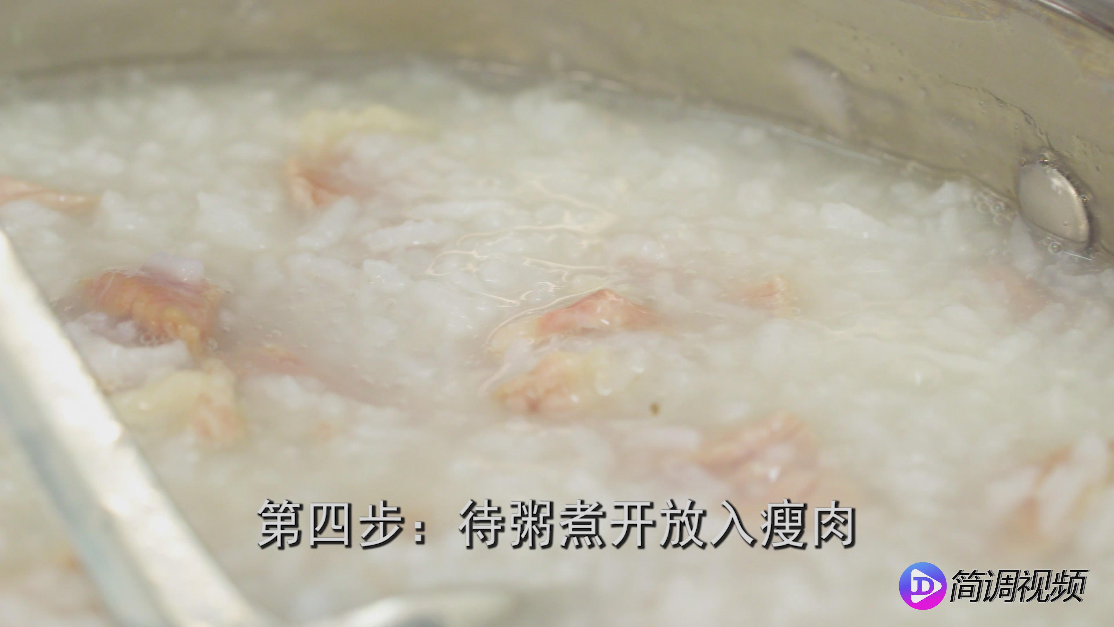 第四步:粥煮开后,加入瘦肉。粥变稠后加入皮蛋,煮10分钟。