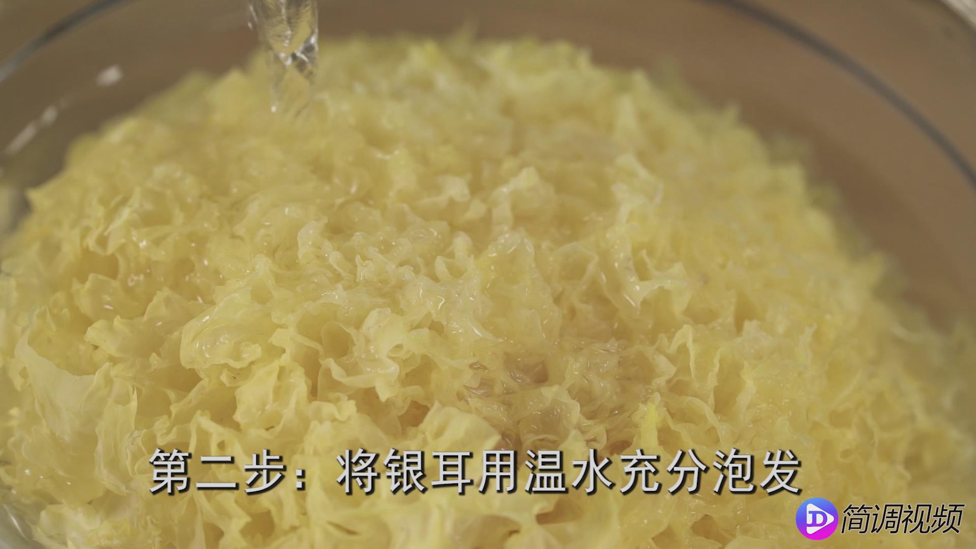 第二步:将银耳用温水浸泡,洗去沉淀物,去掉硬的部分,撕成小朵,沥干水分。