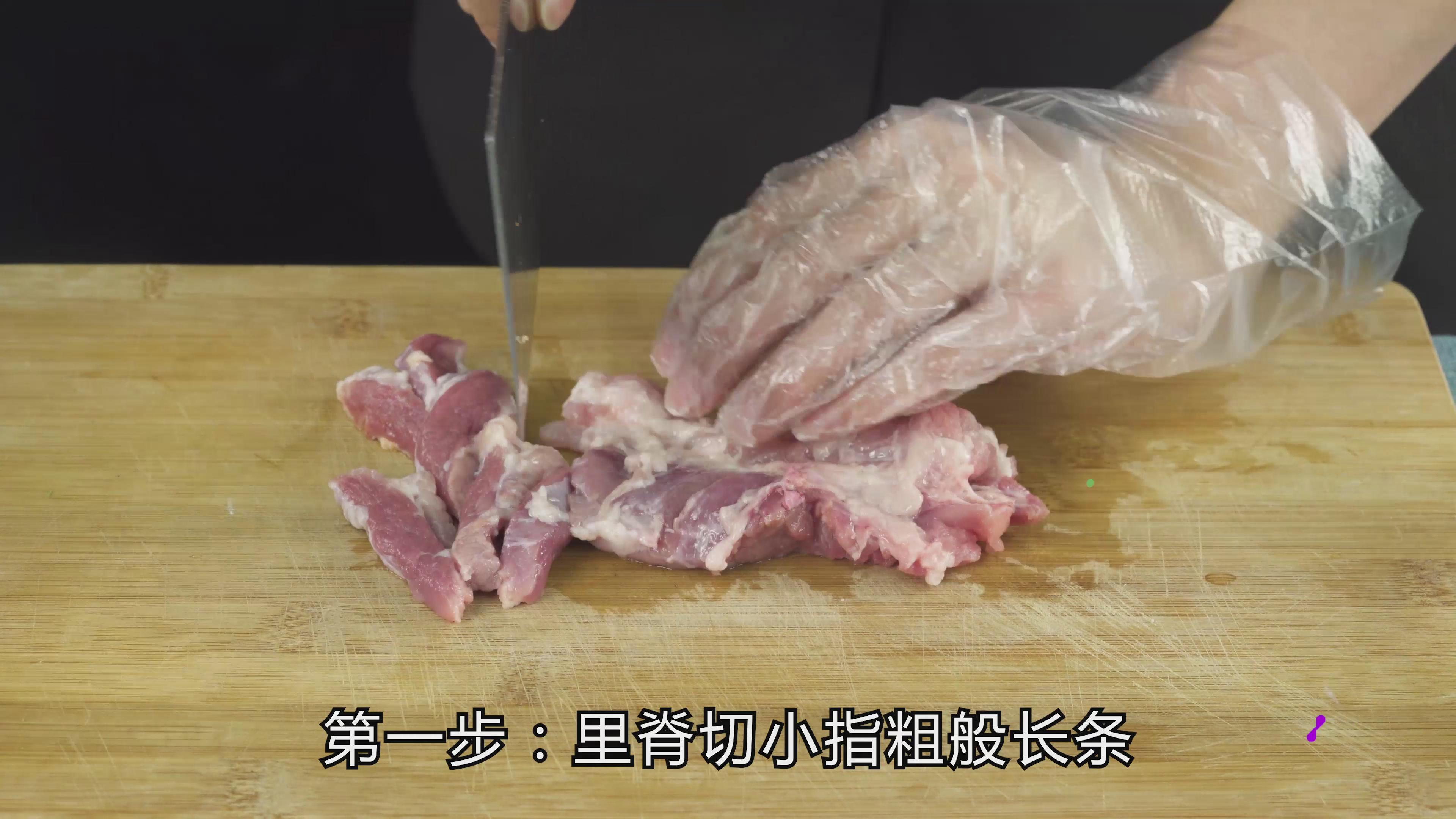 第一步:将里脊肉切成小指粗细的条状,加入盐、料酒和少许糖腌制片刻。