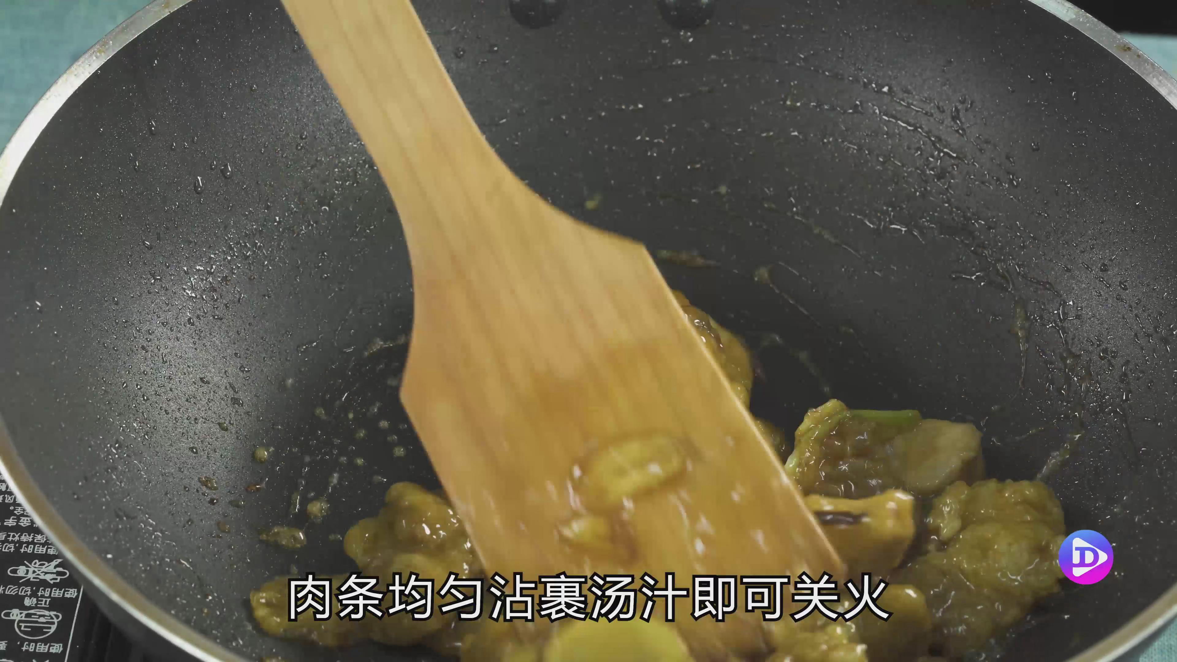 第六步:倒入肉条,快速翻炒。把肉均匀地浸在汤里,关火。