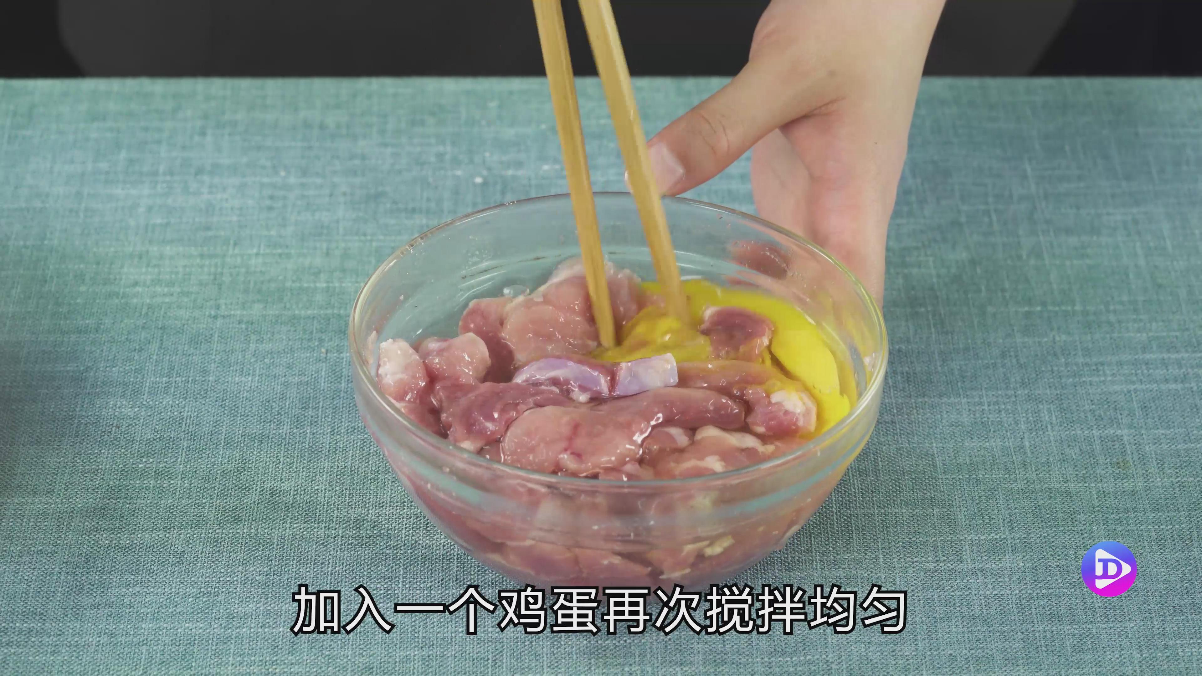 第三步:在腌制好的里脊肉中加入一个鸡蛋,再次搅拌均匀。然后将肉条放入干淀粉中,均匀的裹上淀粉。