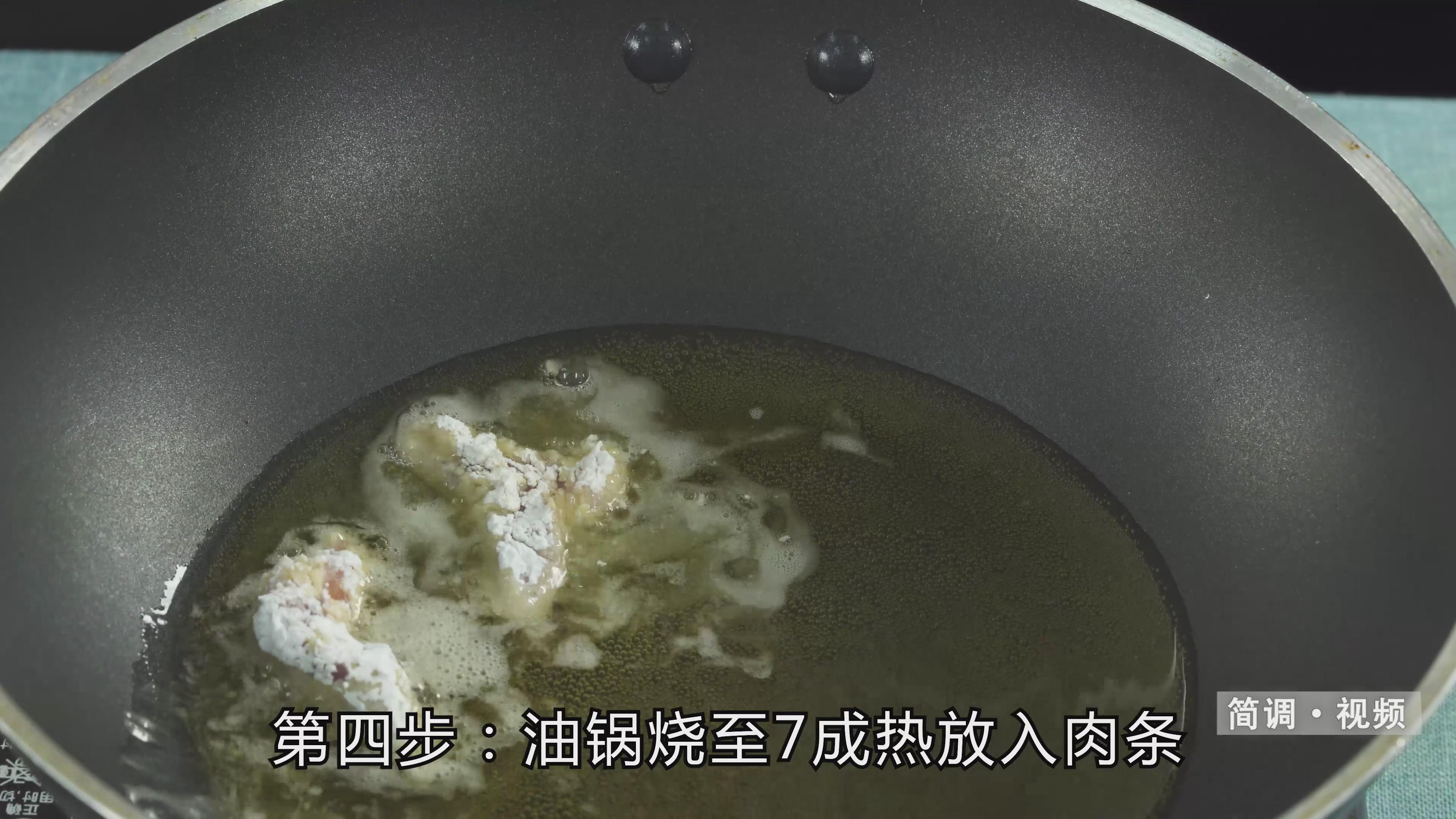 第四步:将油锅加热至七成热,将肉条炸熟,待肉条呈白色时捞出。然后再炸一下,捞出金黄的肉条沥干备用。