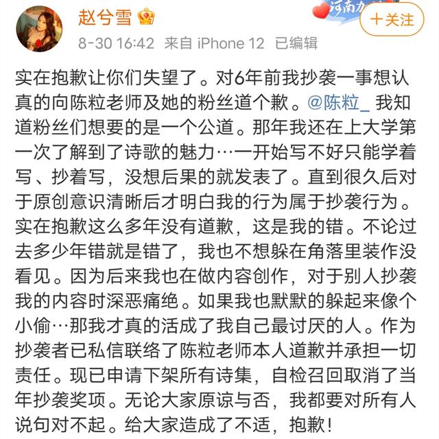在此事在网上不断发酵后,赵兮雪本人也站出来进行了回复。对6年前的抄袭表示道歉,并解释道是因为大学时还不会写诗,就抄着写,结果抄着抄着就发表了。对此小编也很有疑问,难道诗歌投稿不需要检查是否原创吗,还是诗抄歌查不出来。再看她的道歉词,就感觉这个人很奇妙。前面说抄袭很久后意识到那是抄袭行为,抱歉这么多年没道歉;后面又说到自己在做内容创作后,对于别人抄袭她的内容深恶痛绝。这真的是活成了自己最不想活成的样子啊!