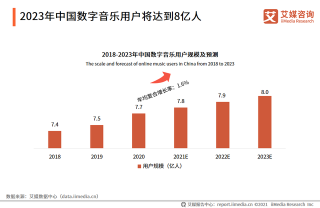 iiMedia Research(艾媒咨询)数据显示,中国数字音乐用户的规模增长放缓,但仍处于增长状态,预计在2023年用户规模可达到8.0亿人,市场格局相对稳定。