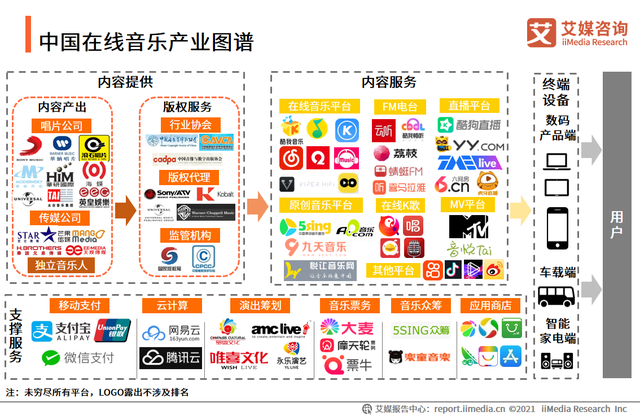 从中国在线音乐产业图谱来看,可以将其粗略分为内容生产方以及内容传播方这两大块。其中,内容生产方又主要细分为唱片公司、传媒公司、独立音乐人以及行业协会等;内容传播方又主要细分为在线音乐平台(TME、网易云音乐、咪咕音乐等)、员工穿过音乐平台(九天音乐等)、FM电台(云听、荔枝、蜻蜓FM、喜马拉雅等)、直播平台(YY直播、虎牙直播等)、以及在线K歌、MV平台等。