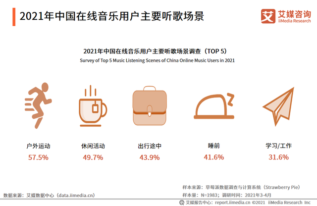 时至今日,“听歌”成为许多人生活的一味调味剂,覆盖户外运动、休闲活动、出行途中、睡前、学习/工作等场景。iiMedia Research(艾媒咨询)数据显示,受访用户主要在伴随性场景听歌,特别对于户外场景,更偏好在运动和出行途中听歌的用户占比分别达到57.5%及43.9%。