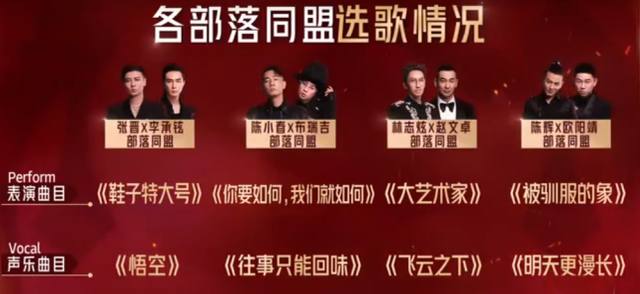 张晋、李承铉部落:《鞋子特大号》、《悟空》陈小春、布瑞吉部落:《你要如何,我们就如何》、《往事只能回味》林志炫、赵文卓部落:《大艺术家》、《飞云之下》陈辉、欧阳靖部落:《被驯服的象》、《明天更漫长》