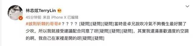 紧接着又与赵文卓因为空调的原因而登上热搜,赵文卓表示林志炫是因为怕唱歌嗓子干不让开空调,而林志炫则表示是赵文卓说养生才没有开空调的。