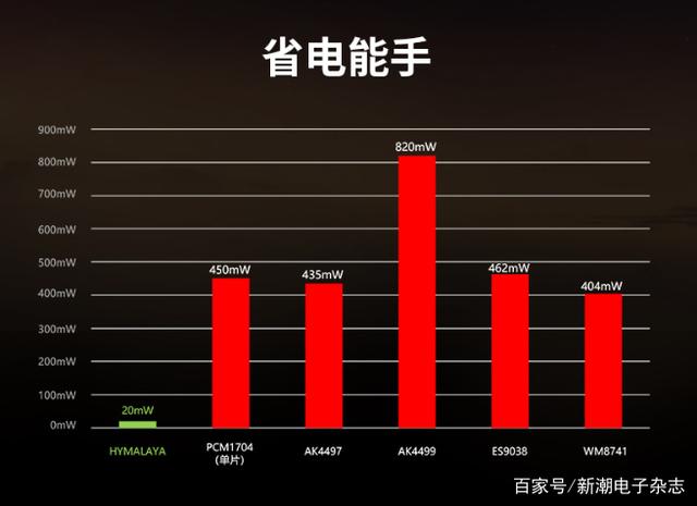HYMALAYA DAC能耗仅为20毫瓦,相比市场上几乎所有的音响级DAC芯片都要低一两个数量级,从PCM1704,AK4497、AK4499、ES9038到WM8741,都是几百毫瓦的能耗。20毫瓦的能耗水平意味着,HYMALAYA DAC应用在智能手机、TWS真无线蓝牙耳机和助听器等消费类电子产品上的基准门槛已经可以被忽略。