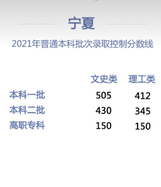 宁夏的文史类一本分数线505分,二本分数线430分;理工类一本分数线为412分,二本分数线是345分;专科文理分数线同为150分。