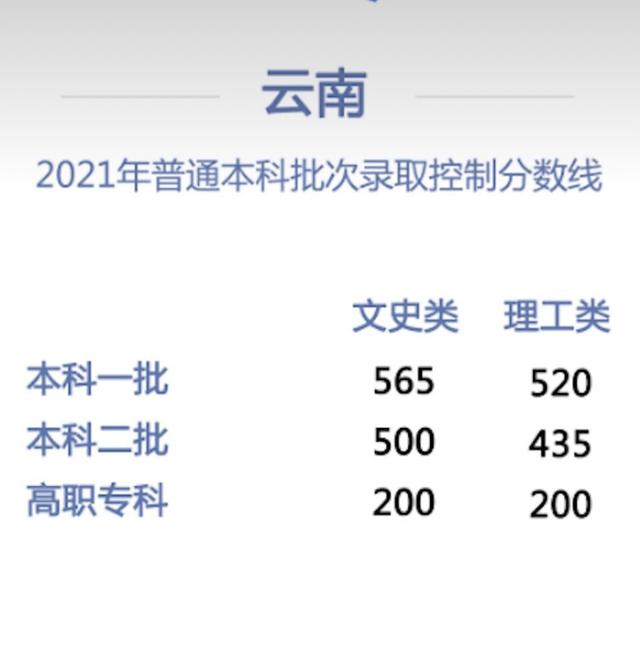 云南省文史类一本分数线为565分,二本分数线是500分;理工类一本分数线是520分,二本分数线为435分;专科文理分数线同样是200分。