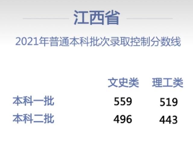 江西省文史类一本分数线559分,二本分数线496分;理工类一本线519分,二本分数线443分。