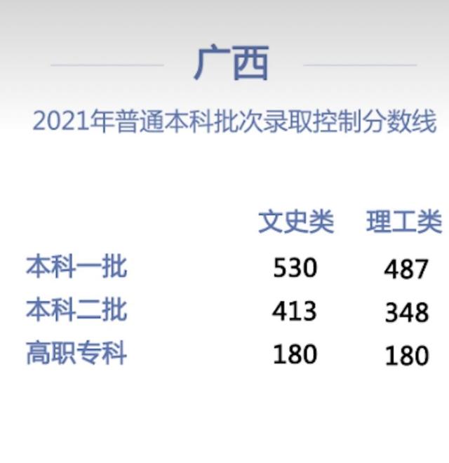 广西省文史类一本分数线530分,二本分数线413分;理工类一本分数线487分,二本分数线348分;专科文理分数线同为180分。