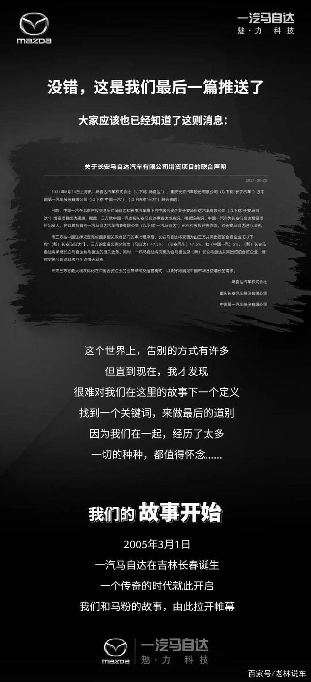 一汽马自达最早成立于2005年3月1日,到现在已经有16年了,在合资品牌中算是一个“老牌”车企了,它在官网发布的最后一篇推送字不多,符合“字越少,事越大”的正常逻辑,我们可以简单总结一下,主要就是一句话:一汽马自达被长安马自达收购了。因此,你所心心念念的阿特兹和CX-4并不会停产,它们只不过“换了个马甲”继续存在。