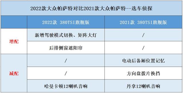 近日,2022款上汽大众帕萨特正式上市,其中燃油版本共计10款车型,官方指导价为17.99-25.09万元。作为中期改款车型,2022款在外观设计和内饰上进行了修改,同时配置上有明显的调整,380TSI(2.0T)旗舰版价格下降3.2万,那么有没有减配的情况?下面我们来详细分析。
