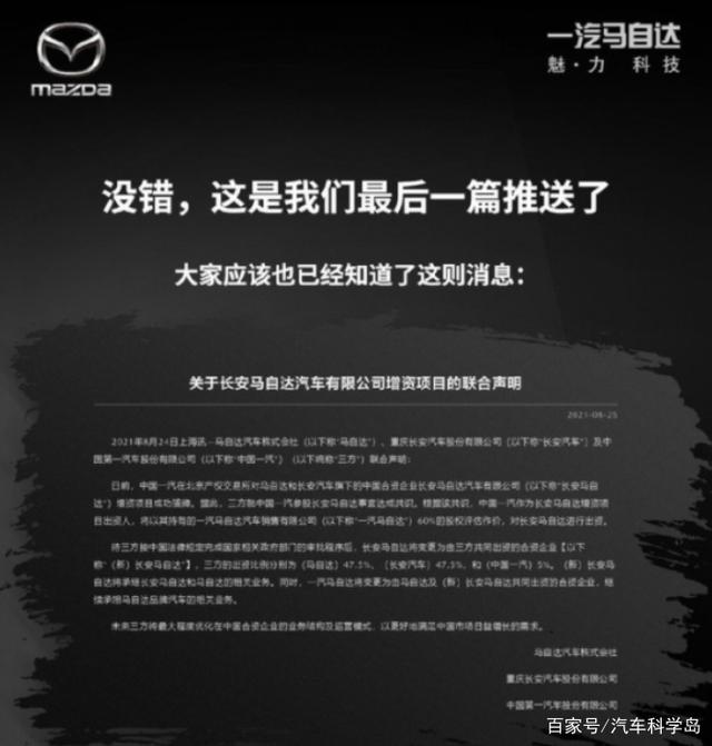 2.《一汽马自达发布最后一篇推文,从此只有长安马自达》仅供读者参考,本网站未对该内容进行证实,对其原创性、真实性、完整性、及时性不作任何保证。