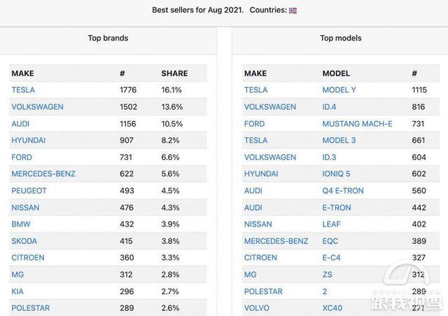 具体数据上,截至8月30日,挪威卖得最好的电动汽车品牌是特斯拉,销量为1776辆,其中,最畅销的车型是Model Y,销量为1,115辆,另外一款车型Model 3也卖出了661辆。紧随其后的是大众汽车,销量为1,502辆,其中有816辆为ID.4,还有604辆为ID.3。排在第三的为奥迪,其主力车型为Q4 e-tron和e-tron,销量分别为560辆和442辆。