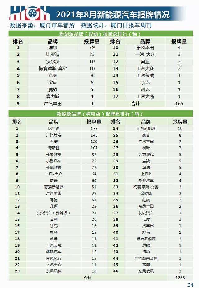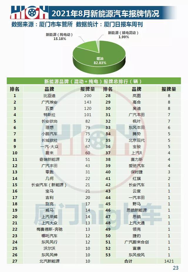 新能源市场8月总报牌1421辆,比亚迪、广汽埃安、五菱、特斯拉、长安欧尚分列前五名。