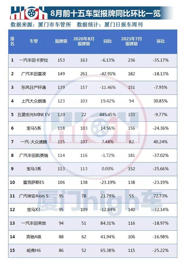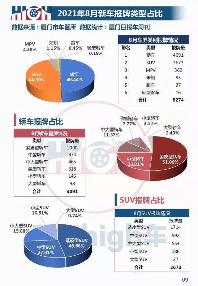来自厦门市车管所的最新数据显示,8月厦门市机动车总报牌13277辆,其中乘用车报牌8274辆,同比去年8月增长5.63%,环比7月下降16.58%。原材料短缺导致的车源不足,以及疫情、台风天气的影响是环比下滑的主要原因。