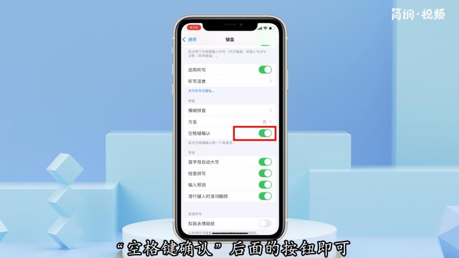 4.进入“键盘”设置后,向下滑动手机屏幕,找到并点击“空格键确认”后面的按钮。