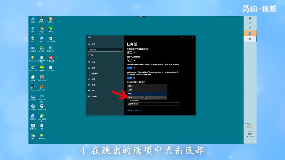 4.在弹出的选项中点击“底部”,这样就可以将任务栏恢复到底部。