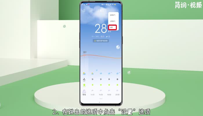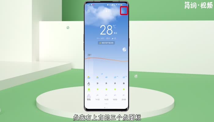 1.打开手机桌面的天气。输入天气后,点击右上方的三个圆点图标;
