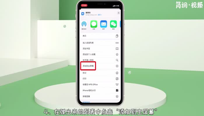 4.在弹出列表中点击“添加到主屏幕”,然后点击右上角的“添加”选项。