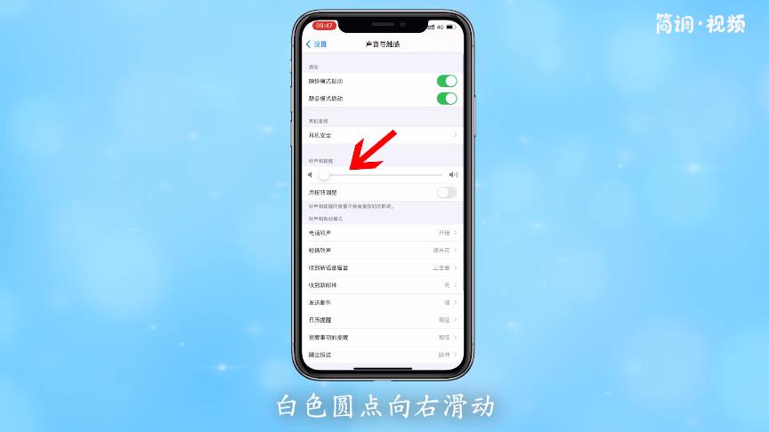 3.向右滑动“铃声和提醒”一栏中的白点,调大铃声音量;所以音量变大。