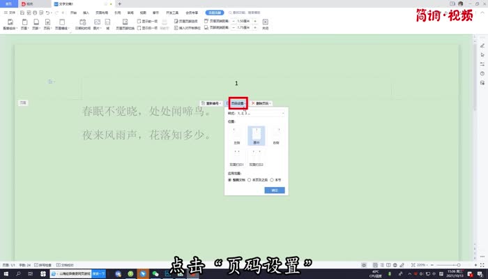 4.点击“重新编号”设置页码个数,点击“页面设置”选择样式、位置和适用范围;