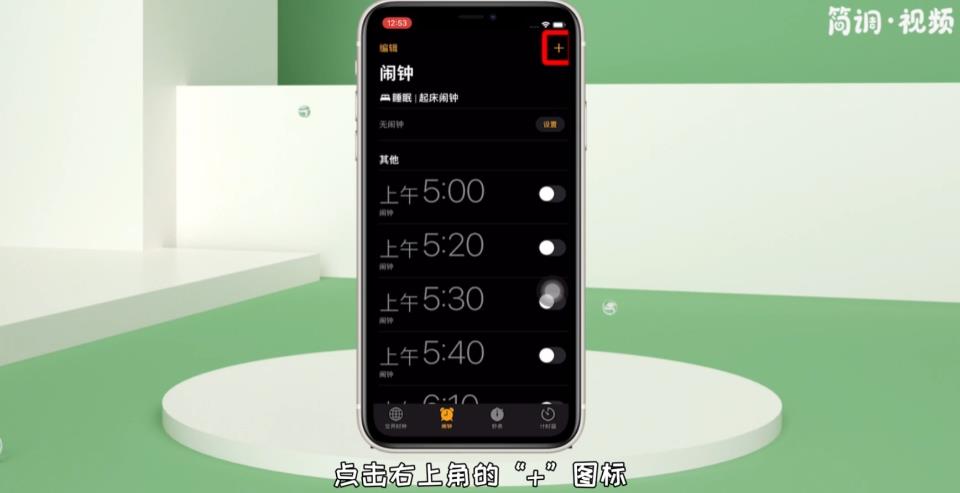 2.进入闹钟页面后,点击右上角的“”图标,进入添加闹钟页面;