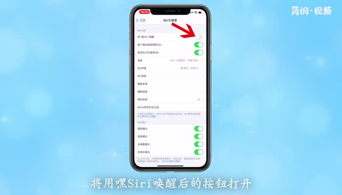 3.进入新页面后,打开“用Hey Siri唤醒”后的按钮,然后在出现的页面中点击继续;