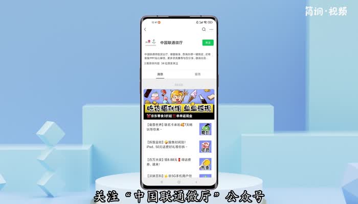 1.打开微信,关注“中国联通微厅”微信官方账号,根据提示绑定手机;