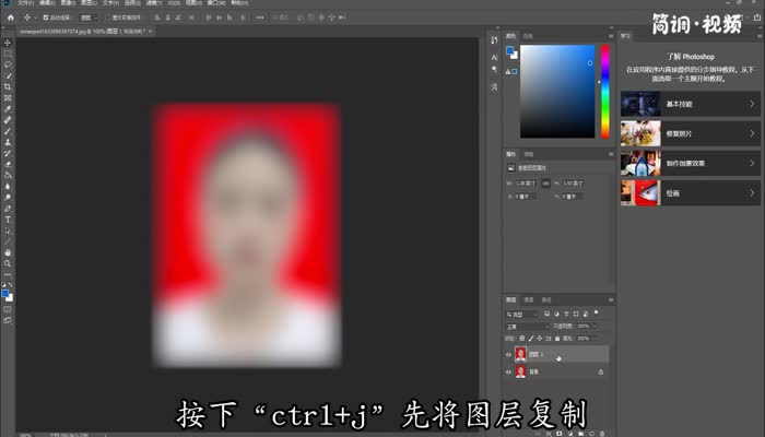 1.在ps中打开要修改的证件照,点击图层,按“ctrl J”先复制图层;