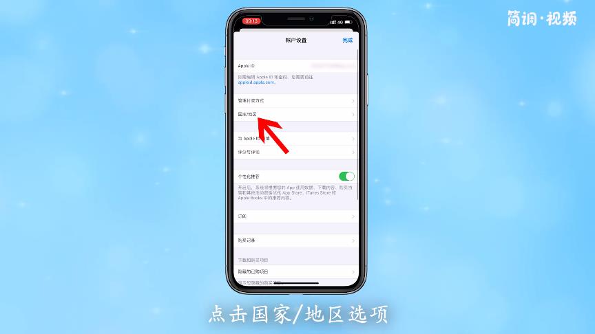 3.在账户设置页面,点击“国家/地区”选项,然后在跳转页面点击“更改国家/地区”选项;