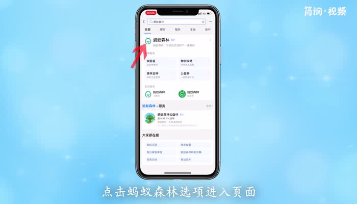 2.在搜索框输入“蚂蚁森林”进行搜索。搜索结果出现后,点击“蚂蚁森林”选项进入页面;