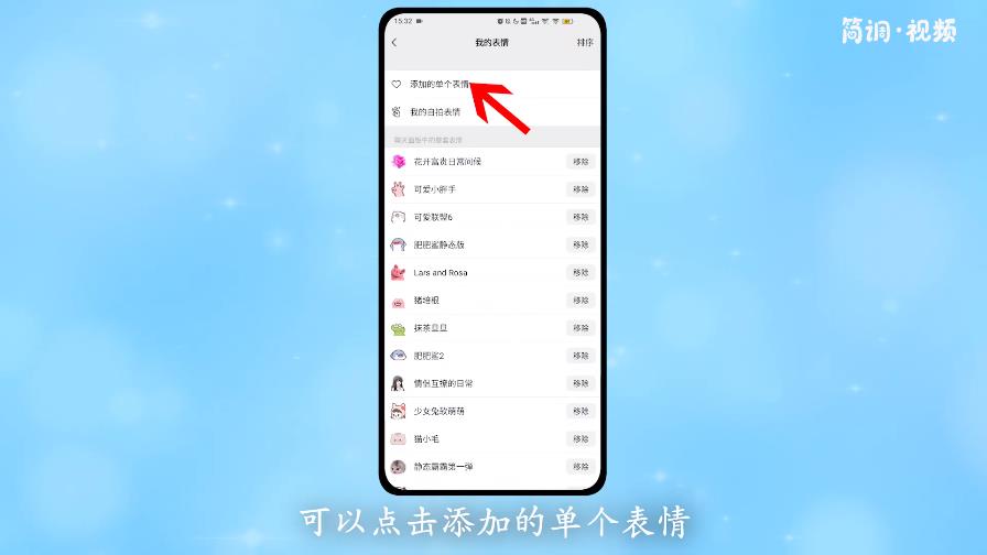 4.如果想删除自己添加的单个表情包,可以点击“添加单个表情”。页面跳转后,点击右上方的“整理”;
