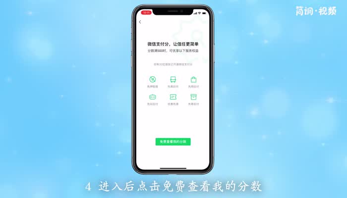 4.进入后,点击“免费查看我的分数”,在弹出的服务协议中点击同意并验证,即可打开微信支付分数。