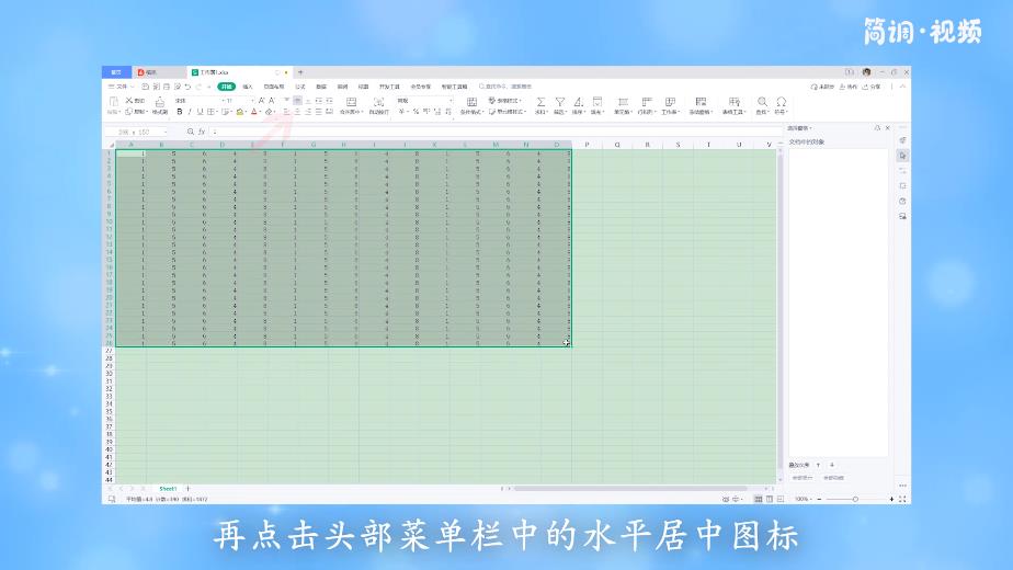 3.如果要将表格设置为居中,选择需要居中的区域,然后点击头部菜单栏中的水平居中图标,将表格数据居中;