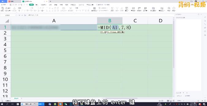 3.在括号中输入三个参数:身份证号所在的单元格,如A1,出生日期的起始位置,一般为7,出生日期的总长度,一般为8。这三个参数用逗号分隔;