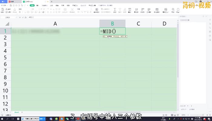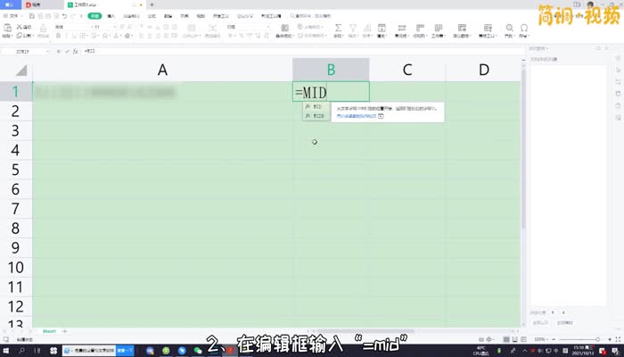 2.在编辑框中输入“=MID”,双击弹出的MID选项;